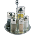 Krydderstativ 6-deler fra APS, komplett med olje og eddik, salt og pepper samt tannpirkere. Det stilige glasset med lokk i rustfritt stål kombineres med et praktisk roterende stativ, noe som gjør det enkelt å nå alle krydderne. Perfekt for restauranter og kafeer som ønsker en elegant og funksjonell borddekking.