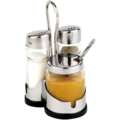 Salt- og pepperkvern med sennepsglass og tilhørende skje fra serien Economic fra APS. Den elegante glassbeholderen med lokk i rustfritt stål og skrulokk sikrer at både krydder og sennep forblir ferske og lett tilgjengelige. Perfekt for restauranter og kafeer som ønsker å kombinere funksjon og stil i sin servering.