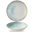 Dyp tallerken fra serien Homespun Accents Aquamarine fra Churchill. En del av den eksklusivt håndmalte porselenskolleksjonen Homespun Accents. Dekorert kantbånd i reaktiv farge med trykt underglasur inspirert av et moderne og minimalistisk utgangspunkt.
