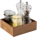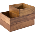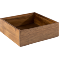 Trälåda 15x15 cm fra serien Woody fra APS er laget av bærekraftig akasietre, noe som gir den både robusthet og en naturlig, elegant finish. Perfekt for å organisere små tilbehør i restauranter, kafeer eller bufféoppsett.