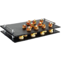 • Skiferfat GN 1/1 fra APS er et elegant serveringsfat i naturlig skifer som gir en rustikk og solid følelse. Fatet er utstyrt med håndtak i forkrommet metall, noe som ikke bare gjør det stabelbart, men også skaper et praktisk rom mellom fatene. Dette gjør det enkelt å forberede og oppbevare snitter og andre godsaker på en smidig måte, klare til å serveres. Passer utmerket for ulike serveringstilfeller, enten det er ved mingling eller direkte ved bordet.