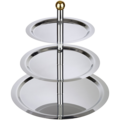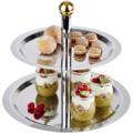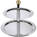 Rustfritt kakefat i to etasjer fra serien Finesse fra APS. Enkel og elegant design i rustfritt stål med hevede kanter. Håndtak i gullfarge for smidig flytting. Passer utmerket på buffébordet eller ved andre serveringstilfeller.
