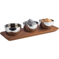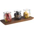 Serveringsbrett 3-fack fra APS lar krydderne eller sausene ta plass på en smakfull måte! Serveringsbrettet er utstyrt med tre spor med en diameter på 6 cm som passer for mindre porsjonsskåler. Brettet er laget av kvalitets akasietre.