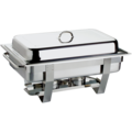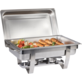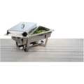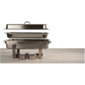Chafing dish Chef GN 1/1 65 mm fra APS. Inneholder to brennstoffbeholder, vannpanne, matpanne, lokk og en robust ramme med lokkholder samt langt hulromshåndtak. Dette settet inkluderer også to brennerholdere og sammenleggbar ramme, noe som gjør det praktisk og funksjonelt for bufféservering og catering.