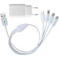 Adapter + Laddkabel 4 till1 från Skandi. Vit kabel med strömadapter kombinerat med en USB A port och fyra USB C portar. Perfekt när du behöver koppla samman eller ladda flera enheter.