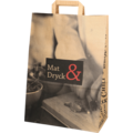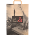 Papppose Mat & Drikke 30L er en bærekraftig bærepose laget av brunt kraftpapir. Den har flate håndtak og er trykket med motivet "Mat & Drikke", noe som gjør den spesielt egnet for dagligvarebutikker, delikatesseforretninger og andre virksomheter innen matvarehandelen. Perfekt for større og tyngre varer.