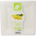 - Hvit engangstallerken laget av bagasse.