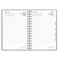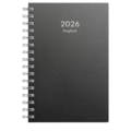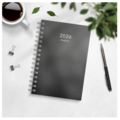 Dagbok refill svart kartong med én dag per side og timeinndeling 8–19. Kalenderens omslag er i svart kartong. Inneholder: kirkelige helligdager, flaggdager, helligdager/aftener, månefaser, navnedager, oversikt over internasjonale helligdager, temadager/hendelser, årsoversikter/årsplaner, utstanset månedsregister.