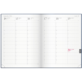 Stor innbundet ukejournal i blått kunstlær med plass for ukens alle avtaler. En uke per oppslag med kvarterinndeling 8-19, kalenderen inneholder internasjonale helligdager samt årsplaner for inneværende og påfølgende år.