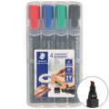 STAEDTLER Lumocolor® Permanent merkepenn med skråspiss. En praktisk plastboks med 4 penner. Kan brukes på nesten alle overflater og smitter ikke. Tørker på et blunk, noe som er ideelt for venstrehendte brukere.