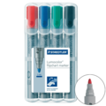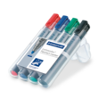 STAEDTLER Lumocolor® Blokkskriver med rund spiss. En praktisk plastboks med 4 penner. Ideell for bruk på papir, da blekket ikke blør gjennom. Pennen tørker på et blunk, noe som gjør den perfekt for venstrehendte brukere.