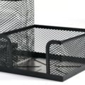 Sort pennekopp og notatblokholder i metallnett fra Mesh-serien. En perfekt måte å organisere skrivebordet på og ha både penner og notatlapper lett tilgjengelig. Den smarte designen sparer plass og gjør det enkelt å holde orden. En elegant og funksjonell detalj som passer like godt på kontoret som på hjemmekontoret. Laget i slitesterk metall med svart finish som gir et moderne og profesjonelt uttrykk.