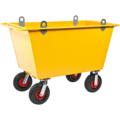 Lettstyrt avfallsvogn med hengerfester på kortsidene og løftekroker for sikker håndtering ved løfting. Avfallsvogn 400 L H: 93 CM GUL fra Kongamek er utmerket til bruk innenfor industri, gjenvinning og på byggeplasser.