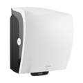 Katrin System Håndkledispenser Hybrid - Hvit er en sensorstyrt dispenser som automatisk dispenserer ett ark om gangen. Den gir kontrollert forbruk og en hygienisk løsning der brukeren kun berører arket som skal brukes.