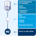 Tork M2 er en turkis dispenser for sentrummatede tørkeruller. Dispenseren gir en forbedret hygiene takket være enkel rengjøring, og den reduserer risikoen for krysskontaminering, siden brukeren kun berører papiret som benyttes.