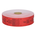 Rød 2-delt garderobebillett 1-500. Helfargede garderobebilletter med klassisk nummerering. Billetter har to deler - øverst en billett med et hull for en kleshenger, nederst en "kvittering"-billett for gjesten.