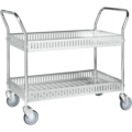 Bordvogn med to plan, høy kant og romslige flater fra Kongamek. Denne galvaniserte plateverket har en lett konstruksjon, to kjørehåndtak og svingbare hjul, noe som gjør vognen enkel å manøvrere til tross for sin størrelse.