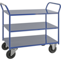 Stadig helsvetsad plåtvagn med praktiska körhandtag och lättrullade hjul varav två med broms. Hyllvagn 3 plan helsvetsad från Kongamek passar utmärkt som förvaringsyta och transportmedel inom produktion och verkstad.