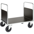 Smidig förzinkad gavelvagn med lastplan och gavelskivor av motståndskraftigt laminat. Gavelvagn serie 500 bromsad från Kongamek lämpar sig utmärkt för transport av varor som kräver stabil stöttning på kortsidorna.