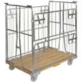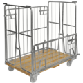 Romslig rullcontainer med en halvhengslet grind på 1200 mm siden som gjør det enkelt å få tilgang til godset. Rullcontainer med trebunn, ubremset fra Kongamek, er galvanisert med bunn av tre for ekstra høy holdbarhet.