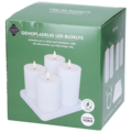 Virkelighedstro bloklys i LED. Hvidt bloklys med 3D-flamme, der giver illusionen af en virkelig flamme, og at stearinen ser nedbrændt ud omkring flammen. Opladningsstation med plads til 4 lys medfølger, så du slipper for at købe mange nye batterier.