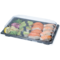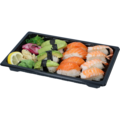 Dette store og rummelige sushitråg med låg er ideelt til takeaway og catering. Med en elegant sort bund og et klart låg tilbyder det en stilren præsentation af sushi. Sushiformen rummer cirka 12–16 sushibiter.