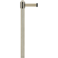Avspärrningsstolpe med grått band från Securit. Stolpen är av polerat rostfritt stål med fyrvägsanslutning och infällbart nylonband. Använd den till att arrangera köer eller spärra av områden.