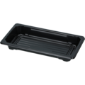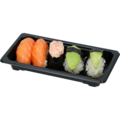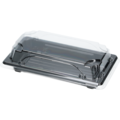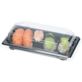 The sushi container for smaller sushi orders! The Sushi Tray & Lid 16X9X4.5CM comes in a rectangular shape with a transparent lid and a black bottom. The sushi container is easy to transport for take-away and is made of PET plastic.