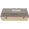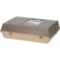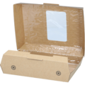Sushi box made of corrugated cardboard with an integrated PET window. Designed to present and transport sushi in a safe and visually appealing way. The dimensions of the box make it suitable for 8–10 sushi pieces, and it fits in standardized SRS trays (full box green).