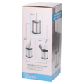 WC-harjasetti ruostumatonta terästä. Setissä on harja ja pidike, pidikkeastiassa on irrtotettava muovinen sisäastia, jonka ansiosta sen puhdistaminen on helppoa. Käytännöllinen ja tyylikäs setti, jossa on taittokansi harjasosan päälle.