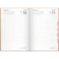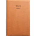 Konjakinruskea päiväkirja keinonahassa kahdella päivällä aukeamalla, joka näyttää nykyisen päivämäärän, viikon ja nimipäivät. Aikajaotus 8-19, tarjoaa runsaasti kirjoitustilaa päivää ja tuntia kohden. Sisältää lisäksi vuosisuunnitelmat kuluvaa ja seuraavaa vuotta varten.