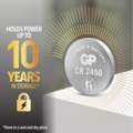 Knappcell, Lithiumbatteri, CR2450 från GP väl lämpat för ett stort antal elektronikartiklar. Kan användas till fjärrkontroller, leksaker, klockor, bilnycklar, miniräknare med mera. Kraftfullt batteri med lång livslängd.