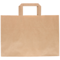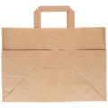 Brun papperskasse med platt handtag, tillverkad av oblekt kraftpapper. Med en volym på 15 liter och måtten 350x170x250 mm är den lämplig för transport av matlådor, mindre varor eller presentartiklar. Konstruktionen med platt botten gör den enkel att packa och stapla.