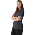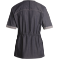 Feminin A-skärning. Rund hals med mjuk jersey. Ärmskärning som inte lyfter skjortan när du rör dig. Extra tryckknapp vid bröstet. En dubbel bröstficka. Två höftfickor med invändig separat mobiltelefonficka. Ergonomiskt placerade höftfickor. Nyckelband. Midjejustering i rygg. Slitsar i sidorna.