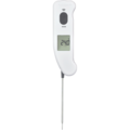 Termometer från Eti. Termometern Thermapen Superfast är två instrument i en termometer där man kombinerar den avancerade tekniken från RayTemp 2 Plus infraröd termometer och Thermapen 4 digital sondtermometer. Thermometern har ett kraftig ABS-fodral innehållandes Biomaster som reducerar bakterietillväxten. Batteritiden förlängs genom att Thermapen har en ett rörelseavkännande läge som gör att den stängs av och på när sonden fälls in och ut. IR: Man riktar termometern mot objektets yta och håller inne knappen. Temperaturen visas sen på skärmen, detta fungerar bara om sonden är i stängt läge. Sonden är rostfri och används till flytande och halvfasta livsmedel.