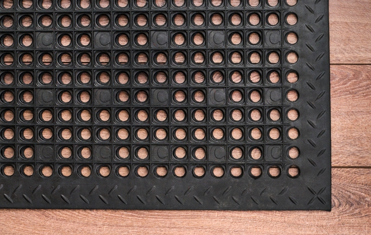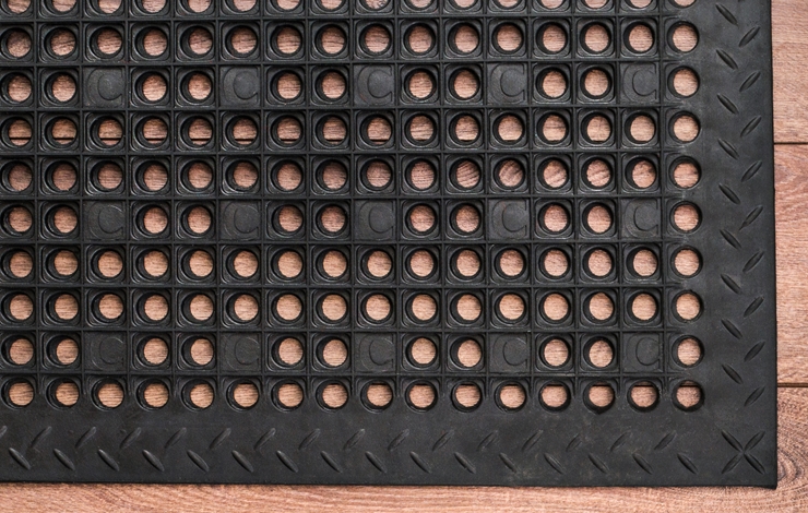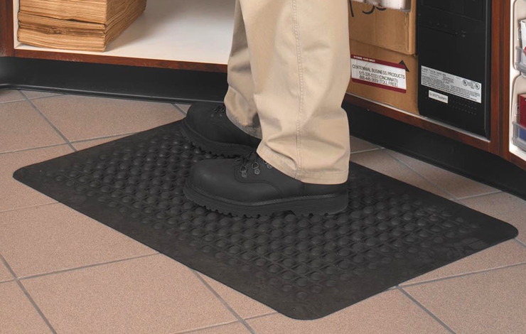 Matten holder seg på plass ved hjelp av sugekopper og matten er formet slik at væske renner igjennom den. Matten er godt, komfortabelt og ergonomisk valg på en arbeidsplass.