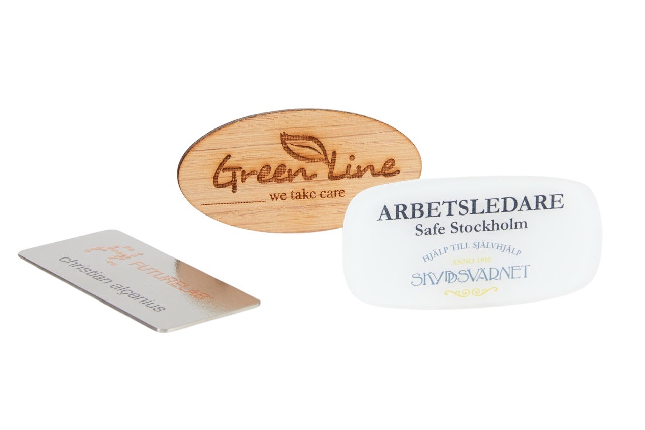Navneskilt er tilgjengelige i enten metall eller plast, og finnes i en rekke forskjellige størrelser og formater. Leveres alltid med en nål som standard, men kan er også mulig å få med magnet.