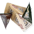Dispenserpakke med porsjonsposer/pyramider som inneholder brunt sukker/rørsukker.