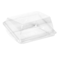 Klar bakelseboks med hengslet lokk laget av gjennomsiktig R-PET. Praktisk bakelseboks for mindre bakverk, smørbrød og mer. Tilpasset alle bransjer, som dagligvarehandel, kafeer, bakerier og konditorier.