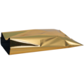 Blank, gullfarget foliepose med åpning på den ene kortsiden. Posen stenges med et gavebånd, en etikett eller tape.