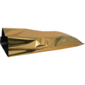 Gullmetallisk foliepose med åpning på den ene kortsiden. Posen stenges med et gavebånd, en etikett eller tape.