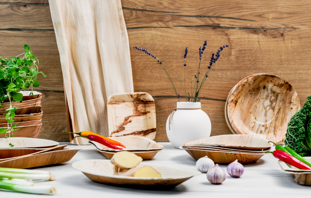 Palmebladproduktene i sortimentet vårt er produsert av en fornybar råvare. Palmebladene faller av trærne av seg selv før de høstes inn. Bladene legges deretter i et vannbad, der de formpresses til ferdige produkter ved en temperatur på 120 °C.
