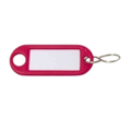 Rød nøkkelbrikke i plast med etikettholder for tekst. Utstyrt med vindu, etikett og S-krok.
