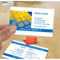 Dobbelsidig visittkort med Quick&Clean fra Avery. Det er enkelt å skrive ut visittkort, plasskort, besøkskort eller lignende med trykkvalitet, i akkurat det antallet du trenger. Quick&Clean-teknologien gjør det enkelt å skrive ut visittkort med helt skarpe kanter og muliggjør utskrift på begge sider.