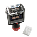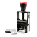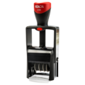 En moderne stempel med stativ og innebygd blekkpatron. Rød/blå blekkpatron følger med som standard. Plass til tekst over og under datoen.