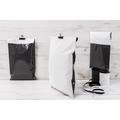 En sort foliepose med hvite prikker og taperemse som lukkemekanisme. Posen er perfekt til butikker som trenger å pakke inn gaver raskt.