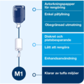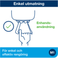 Dispenser Tork M1 er en hvit dispenser som kan brukes til å tørke hender eller til generell rengjøring, tørking og fjerning av smuss på diverse overflater.