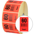 Röda klisteretiketter på rulle med svarta bokstäver med text: "60:- bageri".