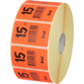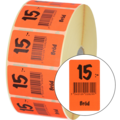 Röda klisteretiketter på rulle med svarta bokstäver med text: "15:- bröd".