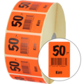Röda klisteretiketter på rulle med svarta bokstäver med text "50:- kött".
